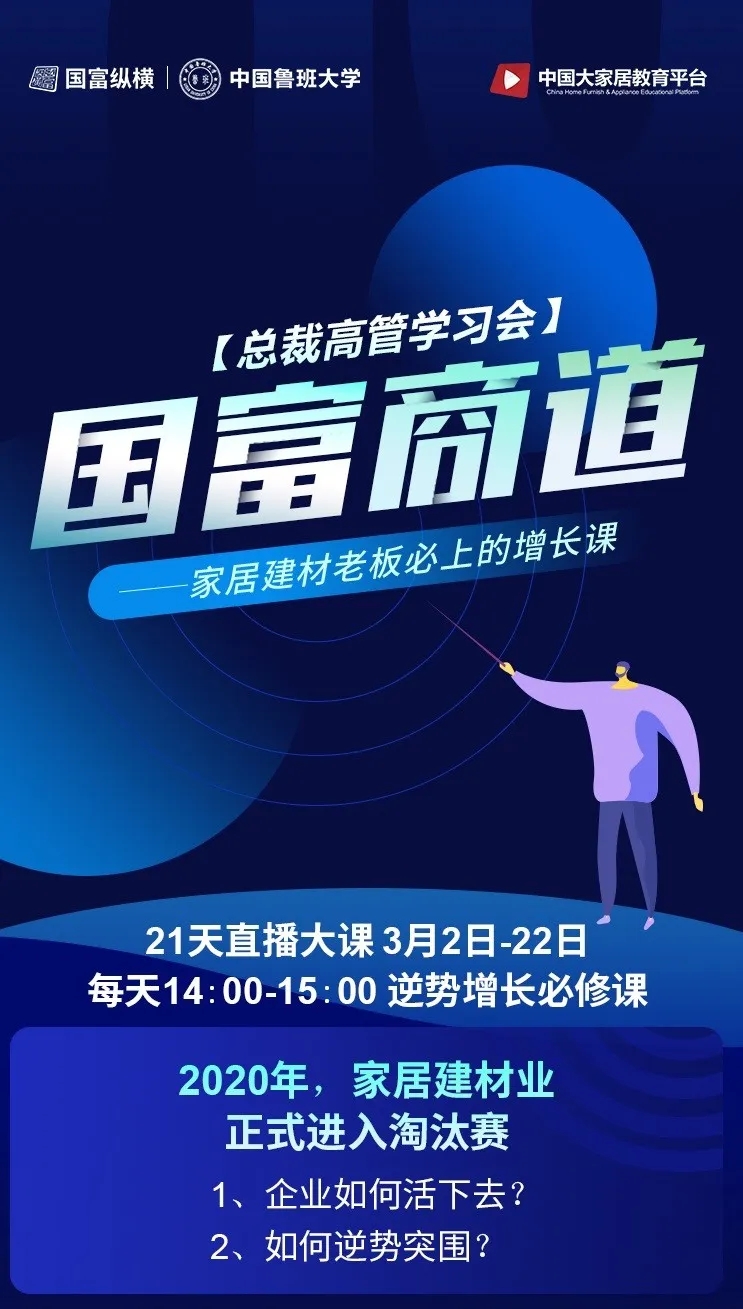 為了幫助家居企業在2020年逆勢突圍,中國魯班大學&國富縱橫重磅推出年度大課——《國富商道》,這是一堂2020家居建材老板必上的增長課,專門針對經銷商老板、中高管和生產企業老板、中高管的專屬課程。自3月2日起至3月22日,中國魯班大學&國富縱橫將通過21天的直播大課為您帶來大變局中的增長戰略,品牌逆勢的運營之道、營銷模式的突破之道、組織強大的鐵軍之道、用戶裂變的增長之道、精細管理的經營之道,一切精彩盡在中國大家居教育平臺,敬請期待!